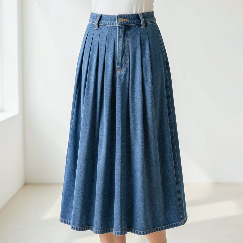 Pleated denim maxi skirts bring a sophisticated flair. The pleats add volume and movement to the skirt.