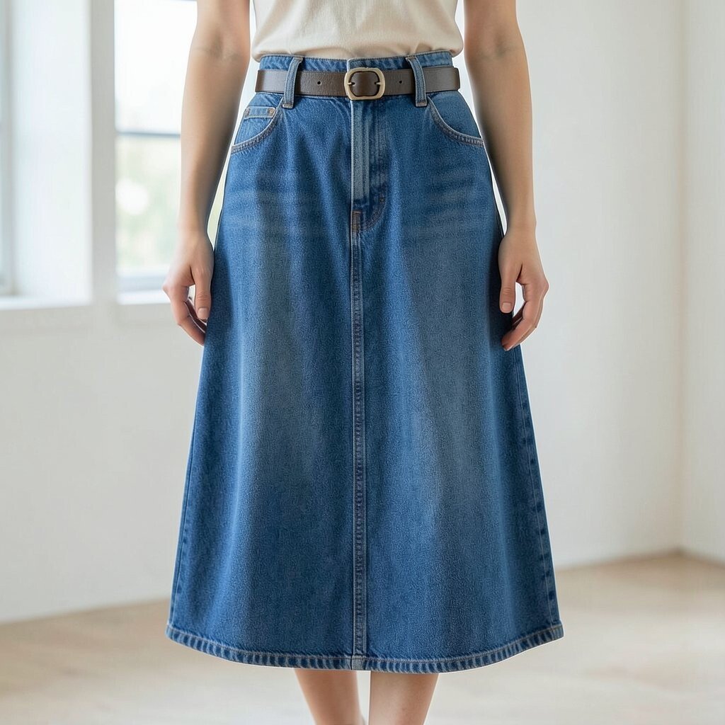 The high-waisted denim maxi skirt is a flattering choice. It cinches at the waist, highlighting your natural curves.