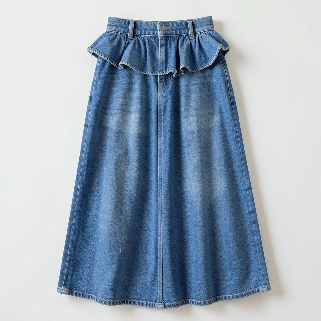 Ruffled denim maxi skirts add a romantic touch. The cascading ruffles create a soft, feminine look.