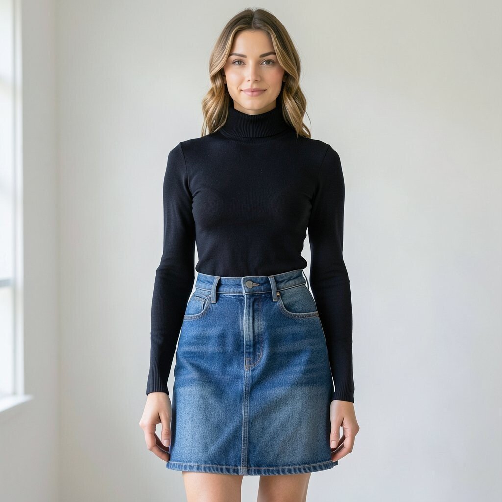 As the temperatures drop, a turtleneck paired with a denim skirt is a cozy, stylish option. This look is perfect for those chilly days when you want to stay warm without sacrificing style. The turtleneck adds sophistication to the casual denim skirt.