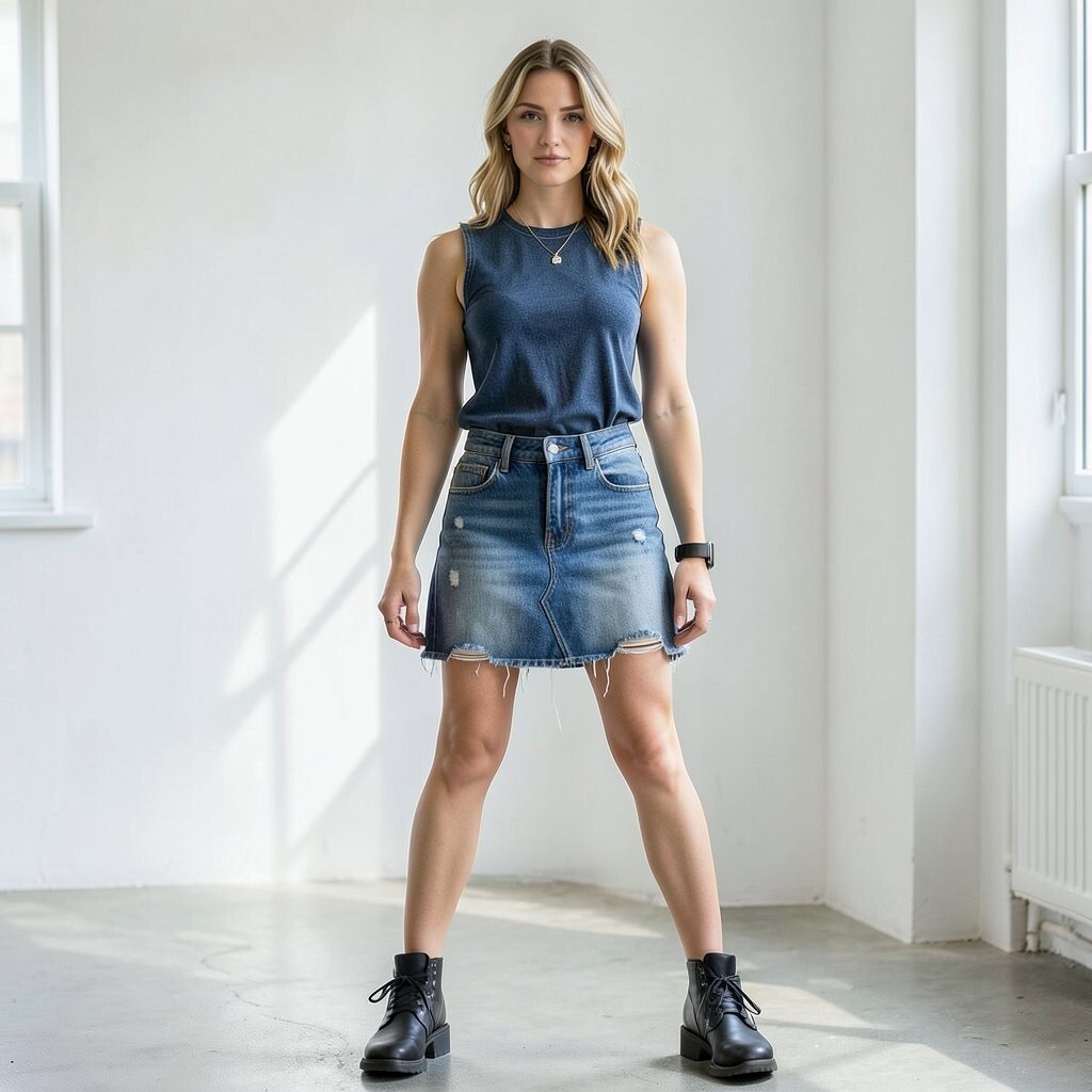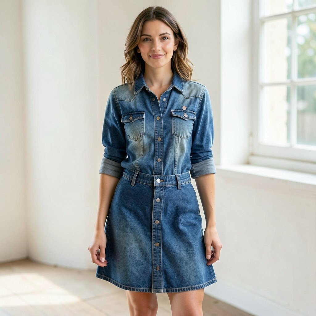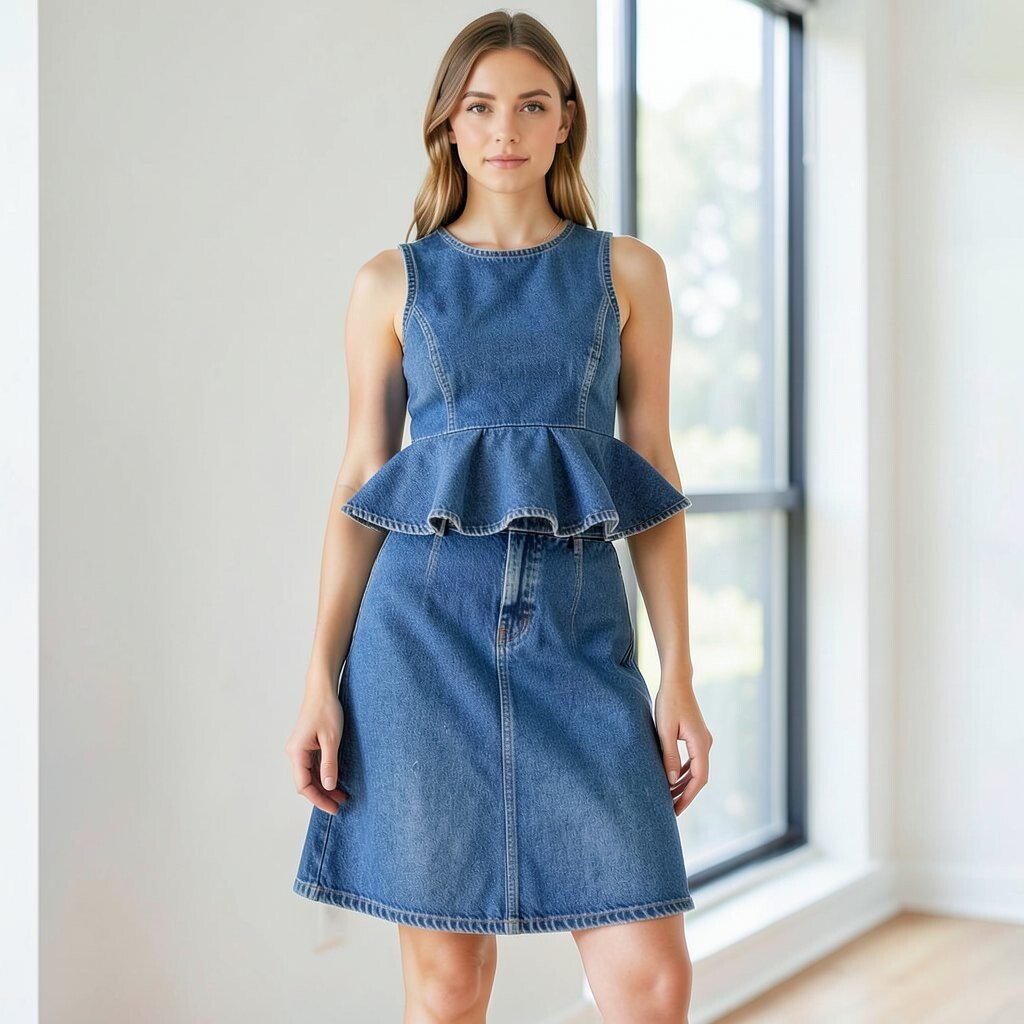 A peplum top paired with a denim skirt creates a flattering silhouette that’s both feminine and fashionable. The peplum adds volume and shape, making it perfect for accentuating your waist. This look is great for a night out or a special event.