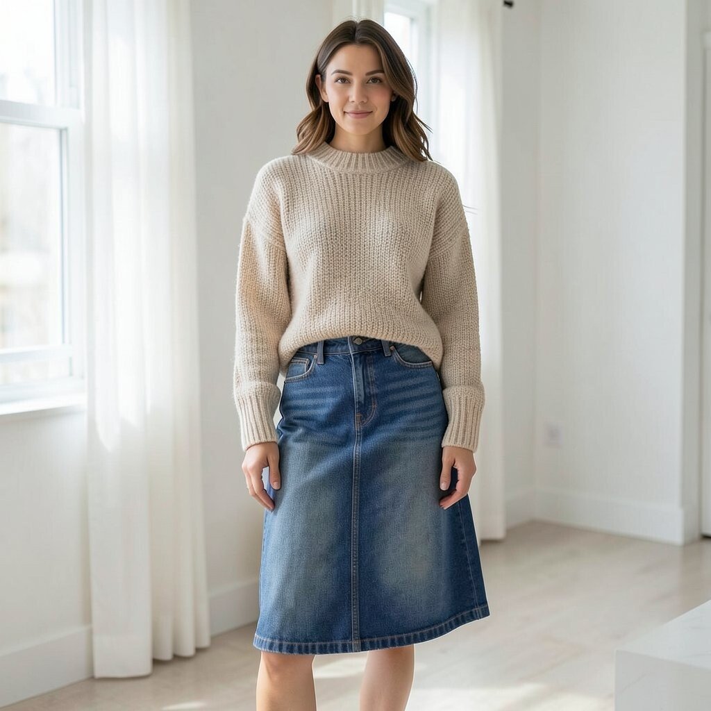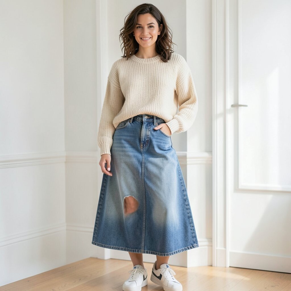 As the weather cools down, staying warm doesn’t mean sacrificing style. Pair your favorite denim skirt with a cozy, oversized sweater. This outfit is perfect for those crisp autumn days when you want to feel snug and stylish.