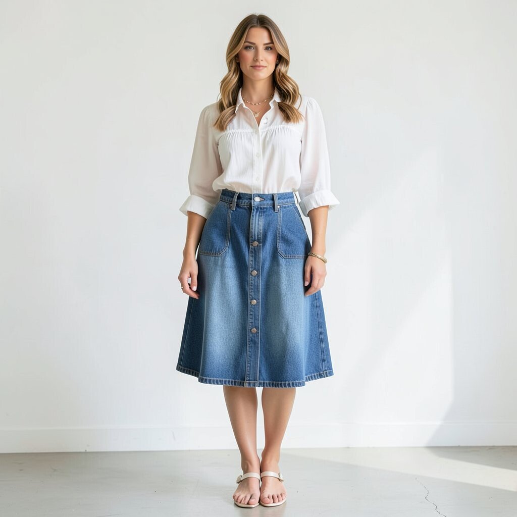 A denim button-down skirt brings a touch of retro charm to any outfit. Pair it with a tucked-in vintage band tee for a fun, nostalgic look. It’s perfect for a casual day out or a trip to the flea market.