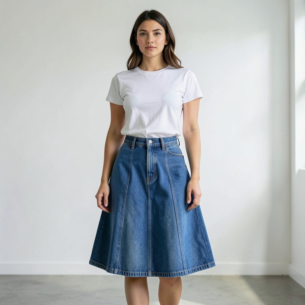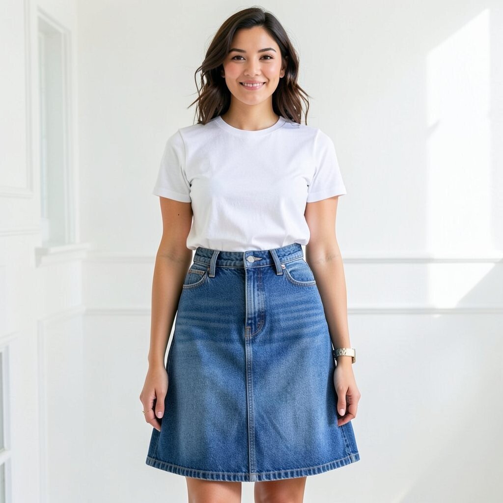 Nothing beats the timeless combination of a white tee and an A-line denim skirt. This combo is simple yet endlessly chic. The A-line shape flatters all body types and gives you a classic silhouette.