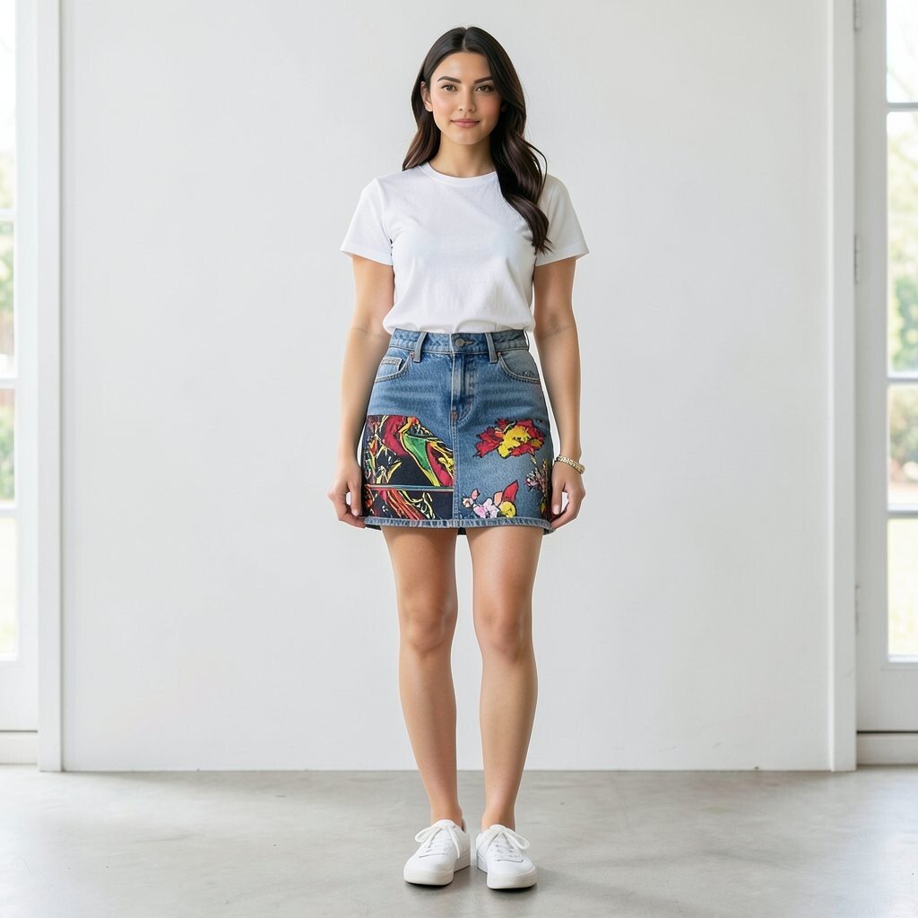Pair your denim skirt with a top in a playful print to inject some fun into your outfit. Whether it’s florals, gingham, or abstract designs, prints add personality and charm. This look is great for casual outings or weekend adventures.