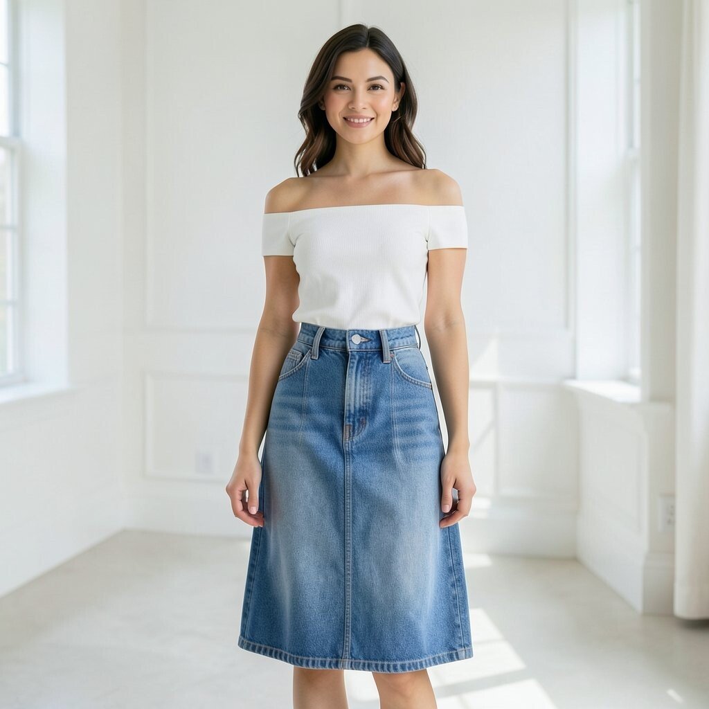 Show off your shoulders with an off-shoulder top paired with a denim skirt. This look is perfect for summer days or beach outings. The off-shoulder style adds a flirty, feminine touch to the casual denim skirt.