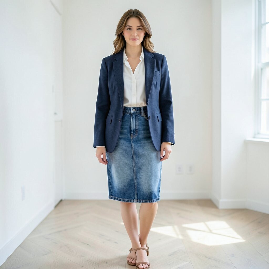For a business casual look, try pairing a denim pencil skirt with a tailored blazer. This is a great way to introduce denim into your work wardrobe. The sleek lines of the pencil skirt combined with the structure of the blazer create a professional yet relaxed look.