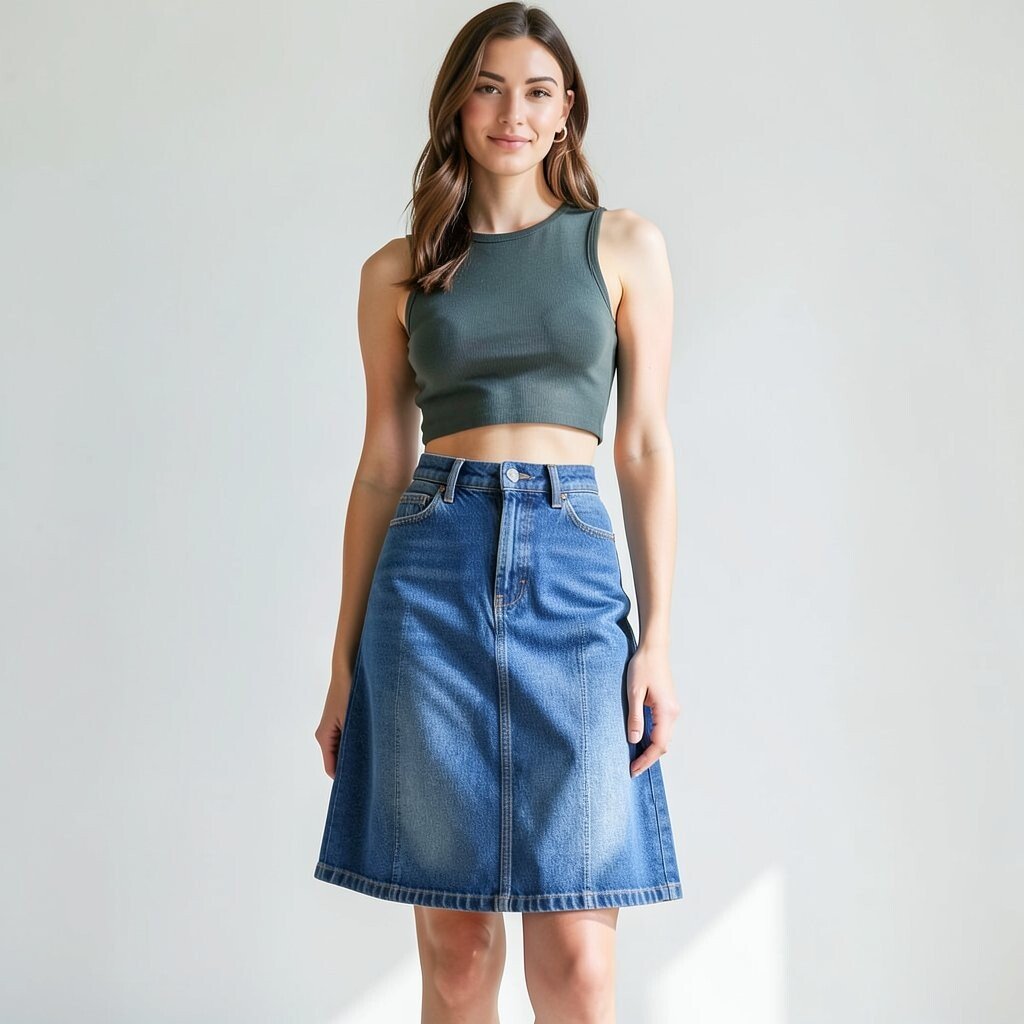 When the weather’s warm, a denim skirt with a crop top is a breezy, stylish choice. This combination is perfect for showing off your midriff and enjoying the sun. It’s a playful and youthful look that’s great for festivals or beach outings.