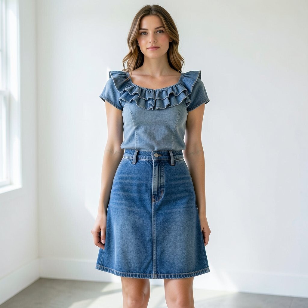 Add some drama to your outfit with a ruffled top paired with a denim skirt. This look is perfect for making a statement and showing off your playful side. The ruffles add volume and movement, making your outfit feel lively and fun.