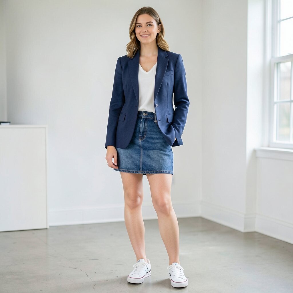 For a look that’s both polished and laid-back, pair your denim skirt with a blazer and sneakers. This combination is great for days when you need to be on the move but still want to look put-together. The blazer adds structure while the sneakers keep it casual.