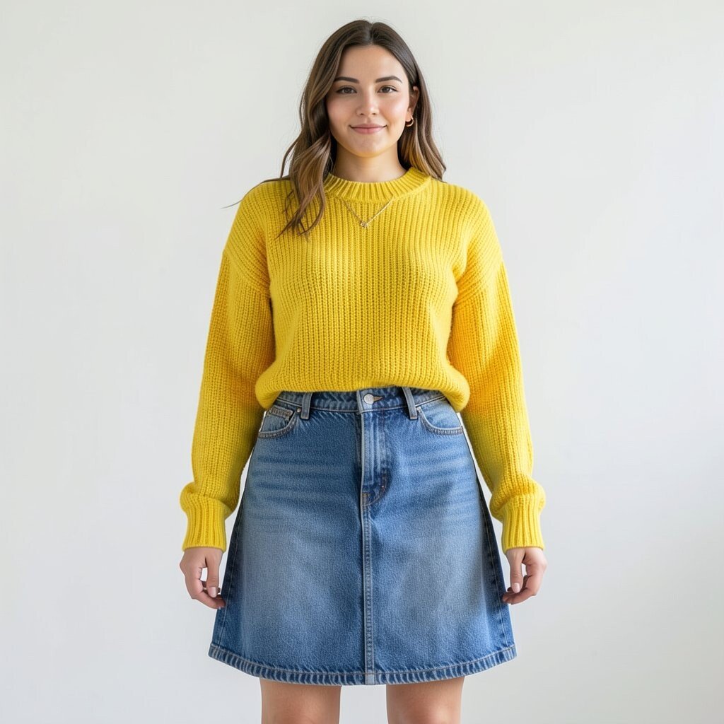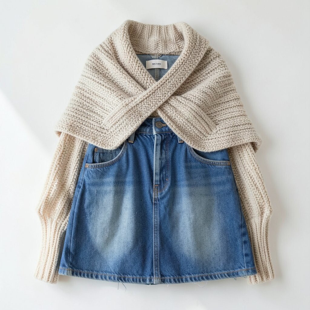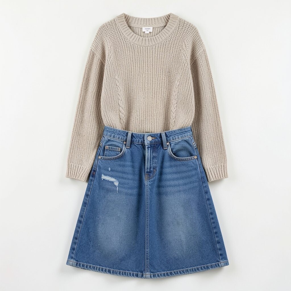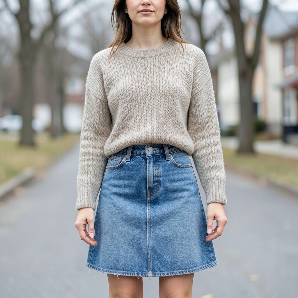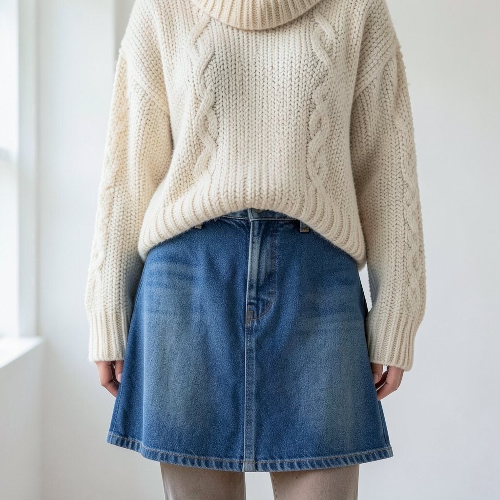 Picture yourself in a cozy, chunky knit sweater paired with a denim skirt. The texture of the sweater adds warmth, while the denim skirt keeps it casual.