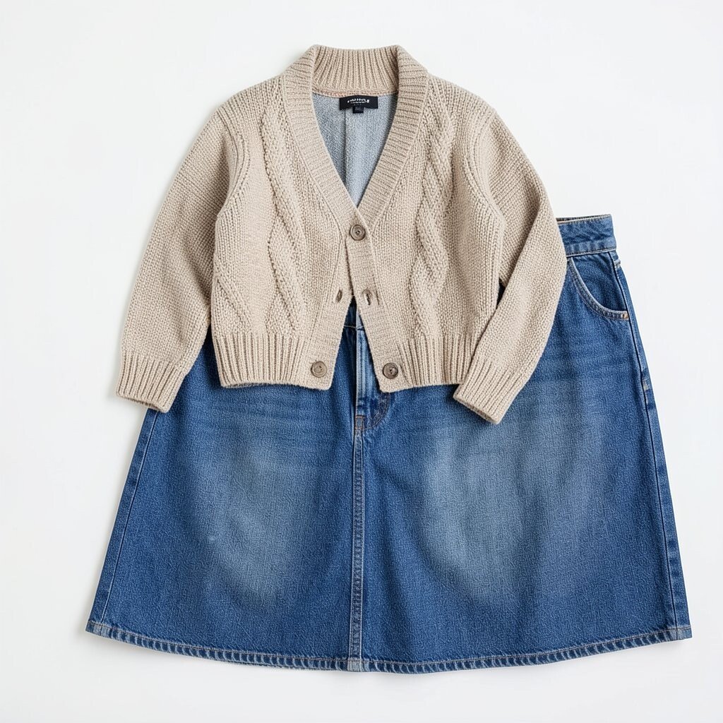 A soft cardigan paired with your denim skirt creates a cozy, layered look. It’s perfect for those in-between days when the weather is unpredictable.