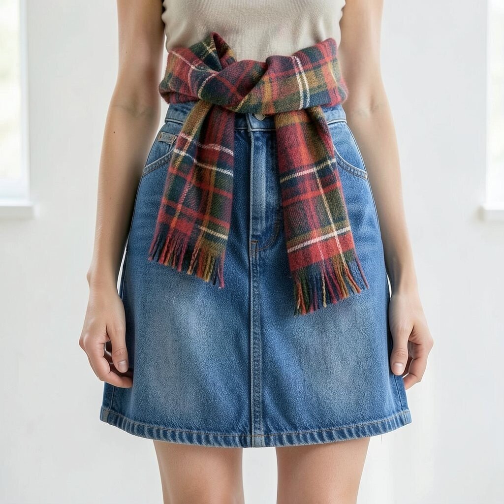 A plaid scarf can add a touch of sophistication to your denim skirt ensemble. It’s an easy way to incorporate patterns into your look.