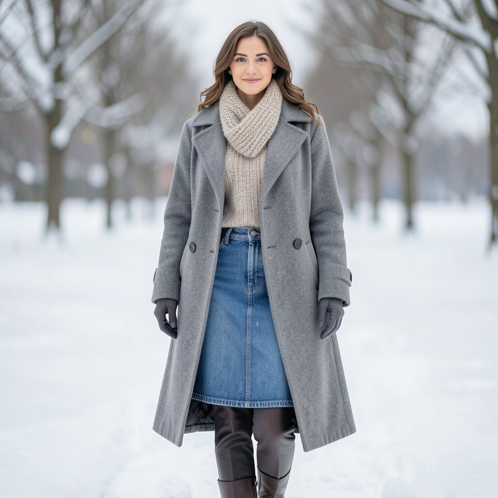 A long coat over a denim skirt is a classic winter look that never goes out of style. It keeps you warm while looking effortlessly chic.