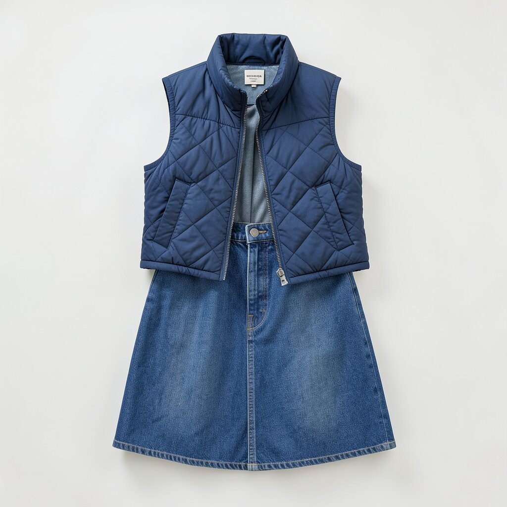 A quilted vest adds a sporty touch to your denim skirt look. It’s a great way to add warmth without being too bulky.
