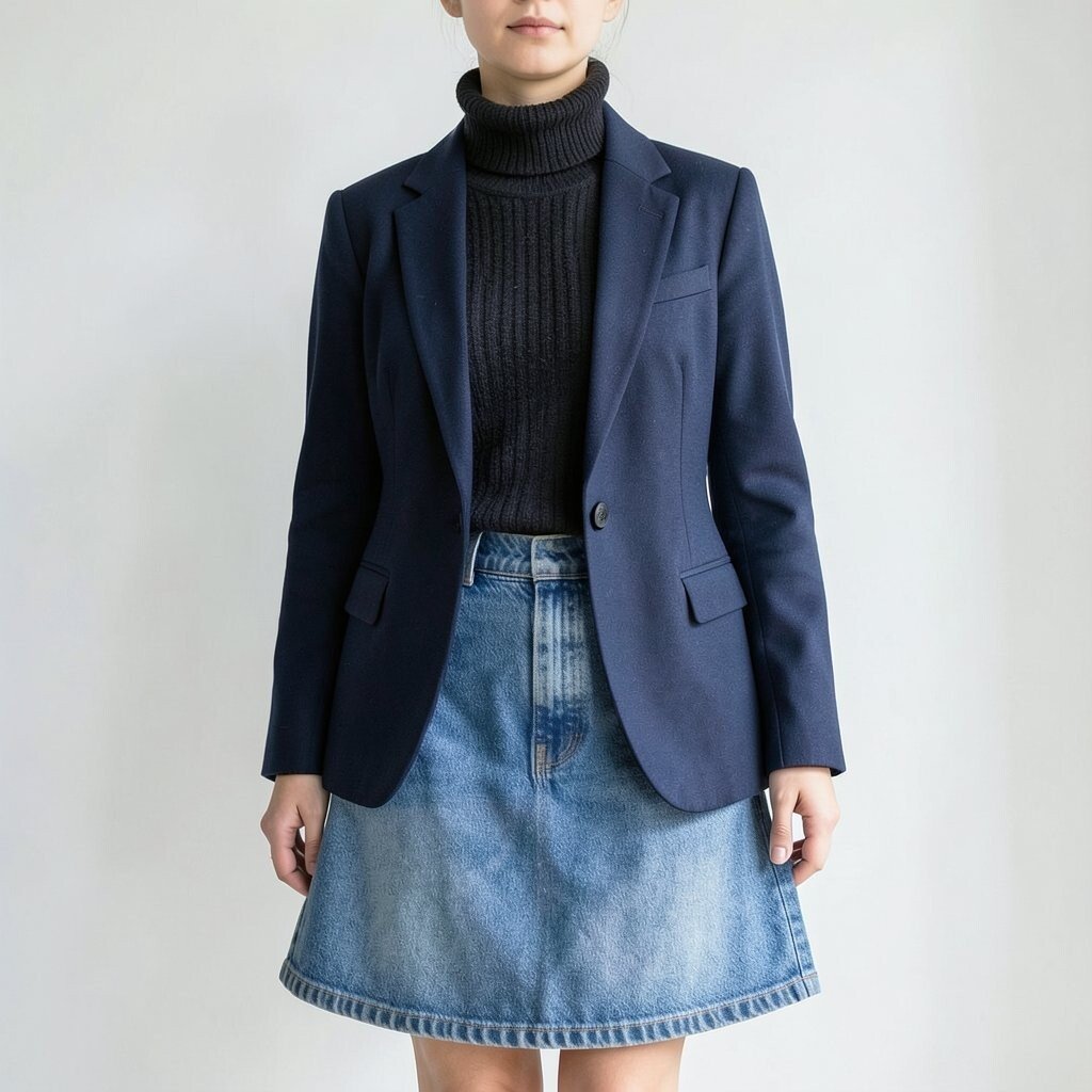 Layering a turtleneck under a smart blazer can transform your denim skirt into a sophisticated winter look. The turtleneck keeps you warm, and the blazer adds a touch of elegance.