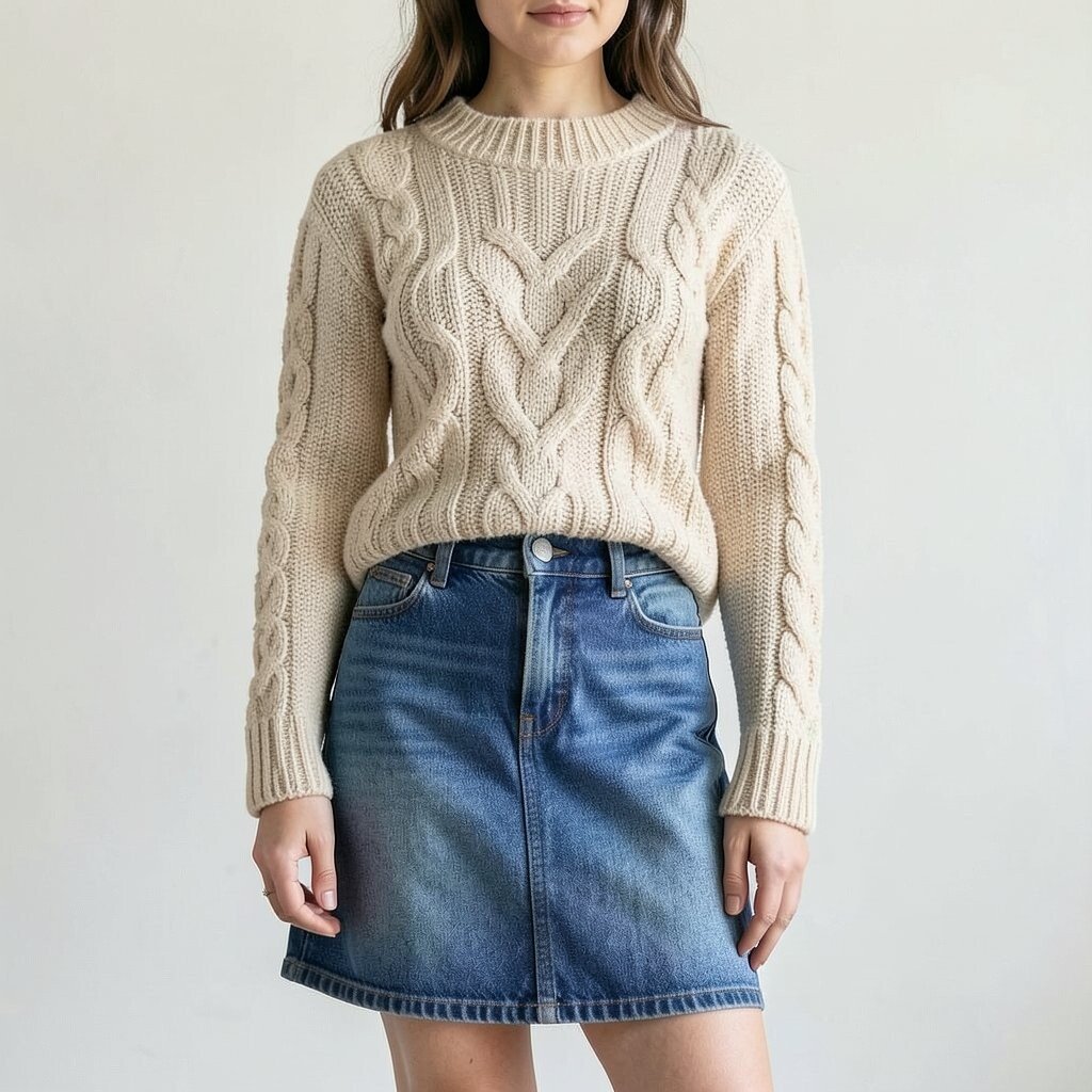 A cable knit sweater adds texture and warmth to your denim skirt outfit. It’s a cozy choice for chilly days.