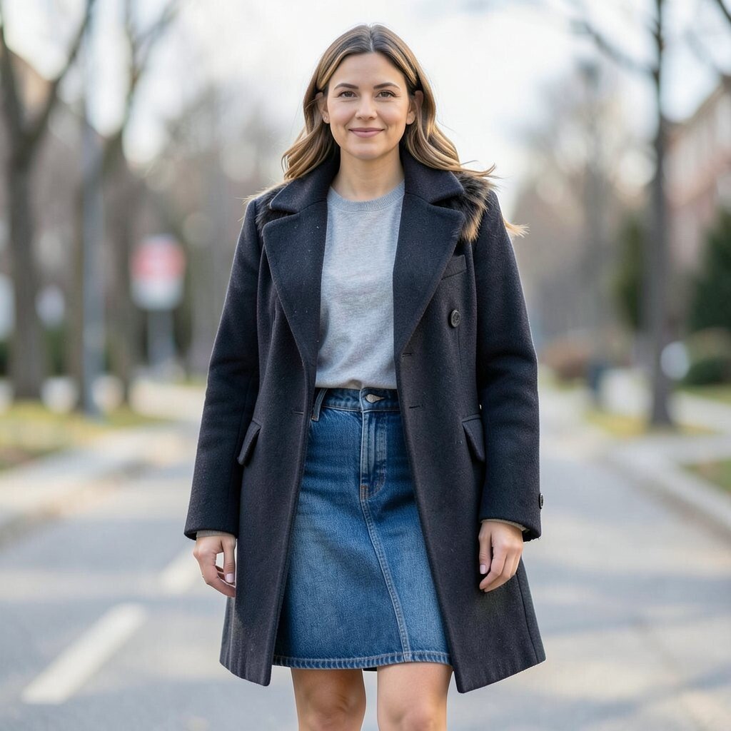 A peacoat adds a touch of elegance to your denim skirt outfit. It’s a classic look that never goes out of style.