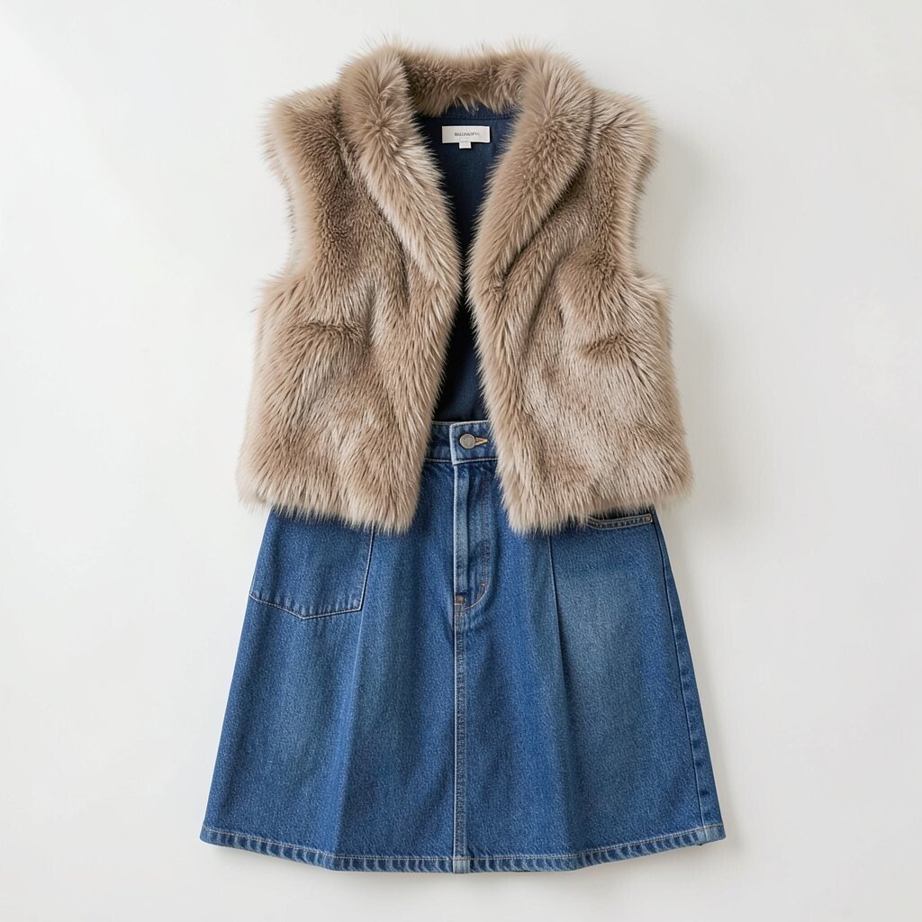 A faux fur vest is a fabulous way to add texture and warmth to your denim skirt outfit. It’s a luxurious touch without being too formal.