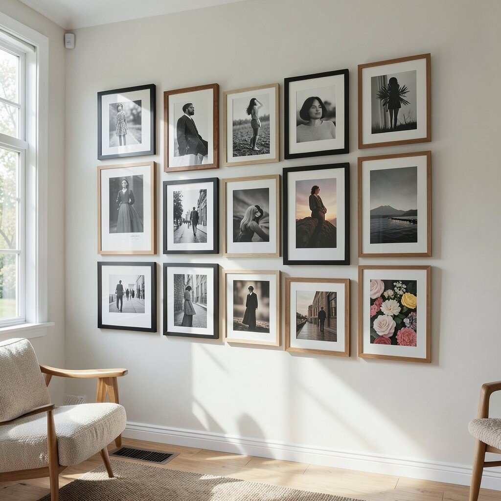 Mix photos, prints, quotes, and small art pieces for a look that feels collected over time. Matching frames can make it neat, while mixed frames can feel more playful.