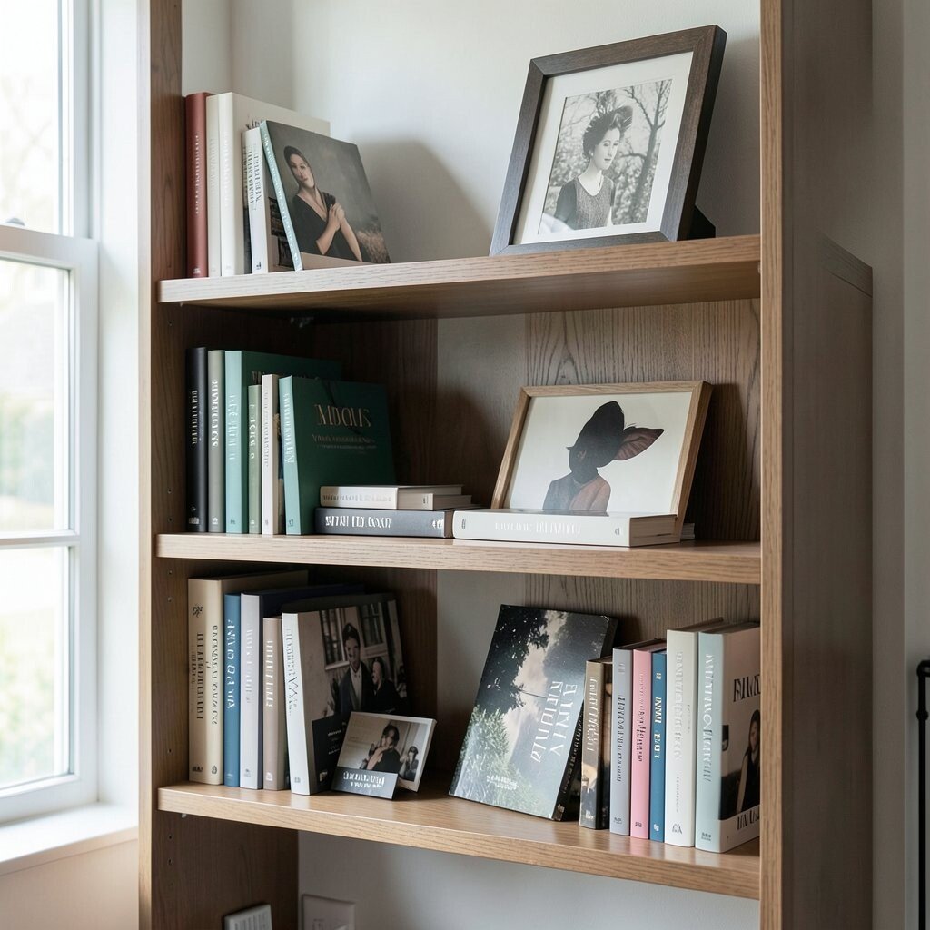 A styled shelf can feel like a tiny art display. Books, framed prints, candles, and small objects can create a neat and lovely scene.