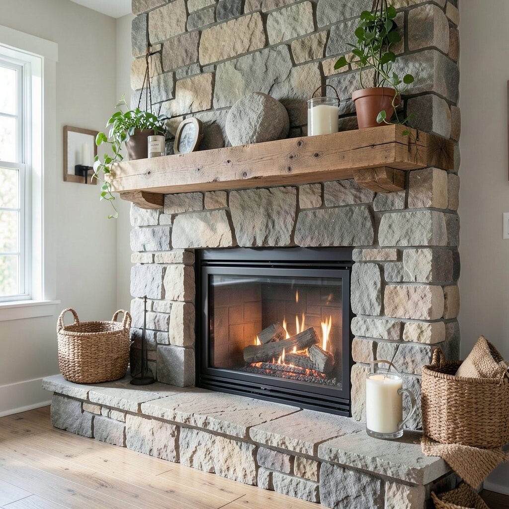 A fireplace look can bring warmth even if you do not have a real fire. Candles, logs, lanterns, or a decorative screen can make the area feel inviting.