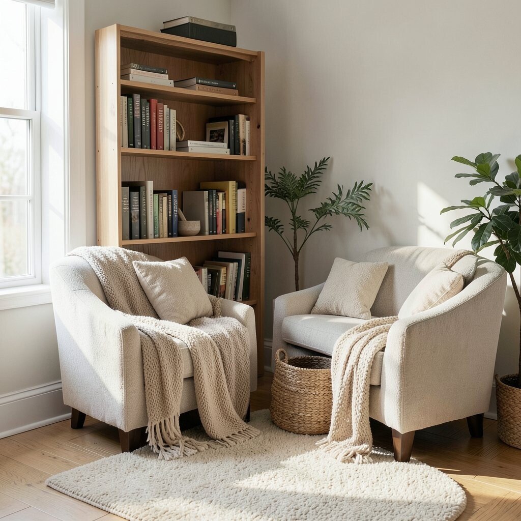 This spot works well in bedrooms, living rooms, or even wide hallways. Pick a chair with soft fabric, add a blanket in your favorite color, and place a basket nearby for books or magazines.