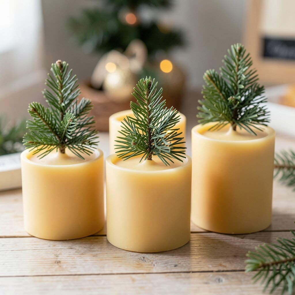 Evergreen toppers add a fresh, forest-like feel to beeswax candles. A tiny cluster of pine, cedar, or fir makes the candle look ready for a winter celebration.