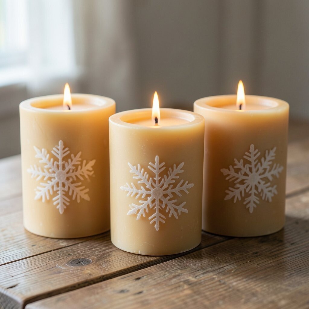 Snowflake stamps give candles a crisp winter look. The tiny patterns make each one feel delicate and special, almost like a frosty window.