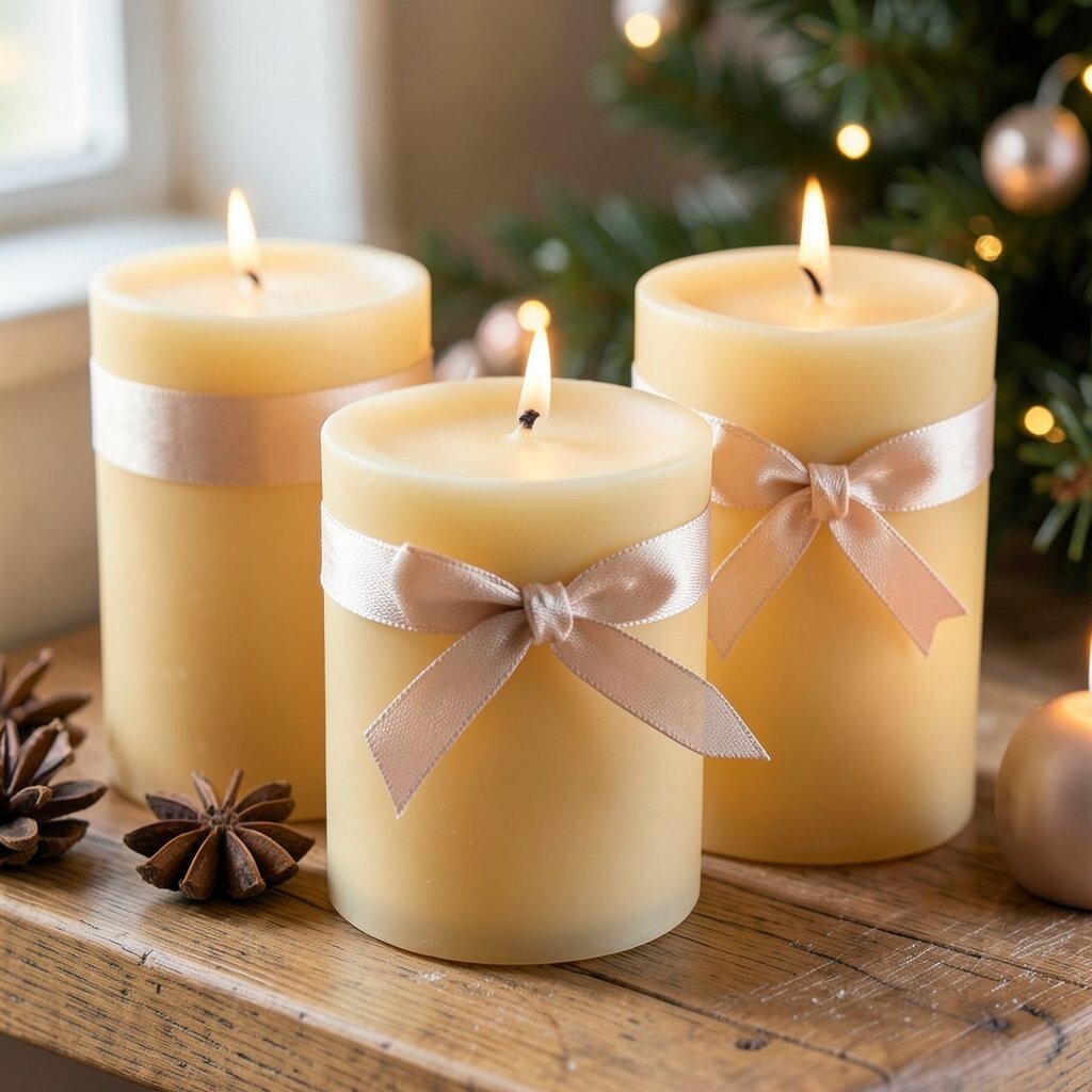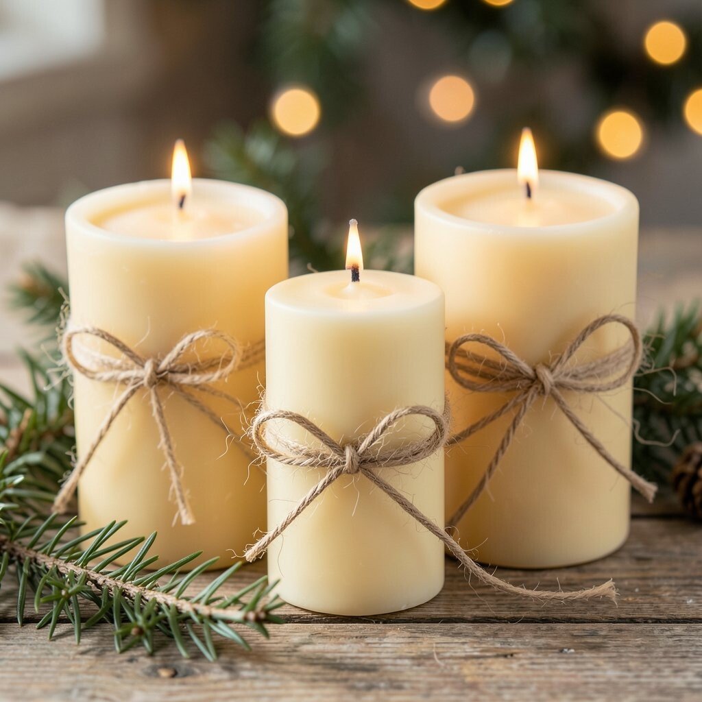 Twine bows give candles a simple, handmade look that feels warm and welcoming. The natural fiber pairs well with the golden wax and works in almost any holiday room.