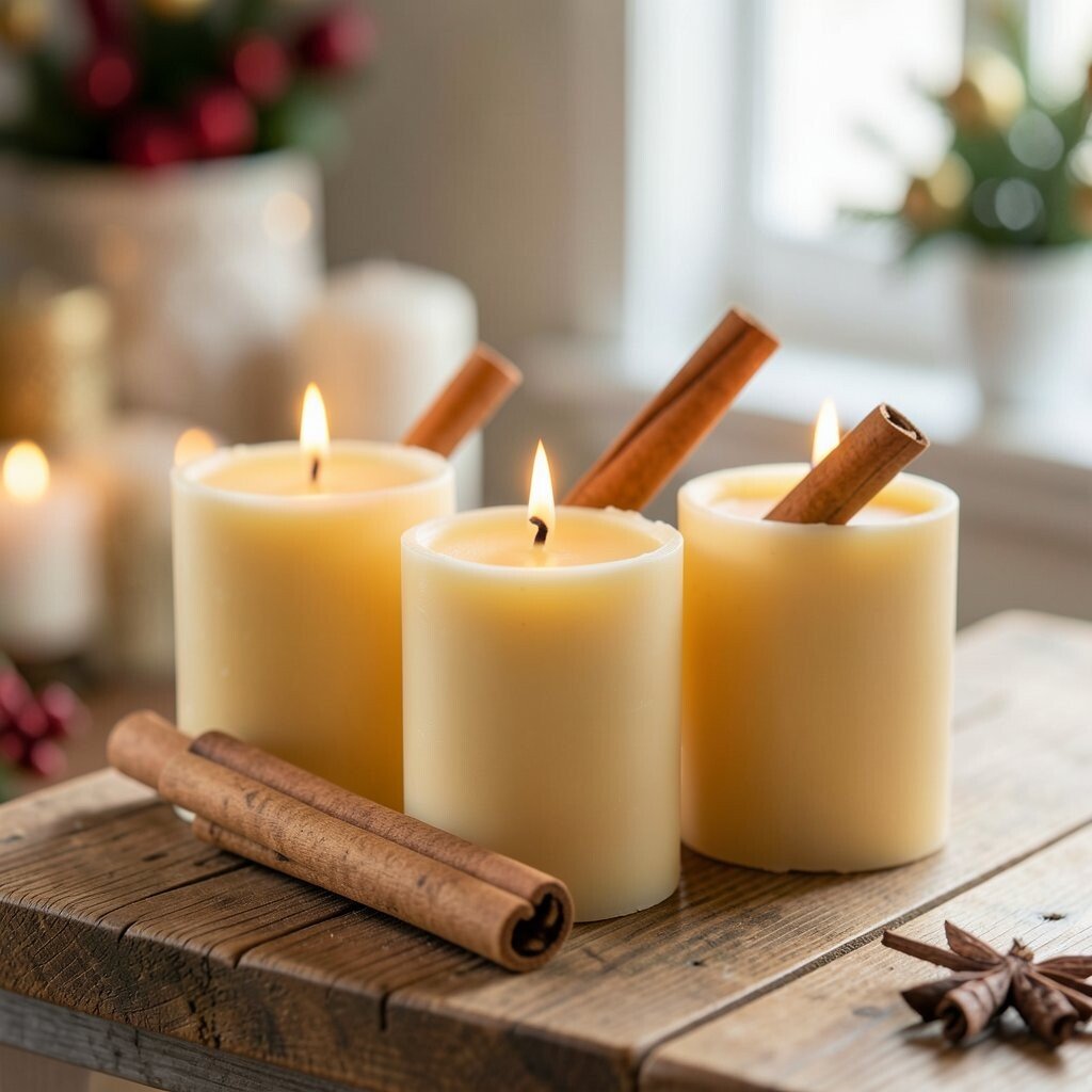 Cinnamon sticks make beeswax candles look warm and inviting. Their brown color and strong holiday scent create a cozy feeling right away.