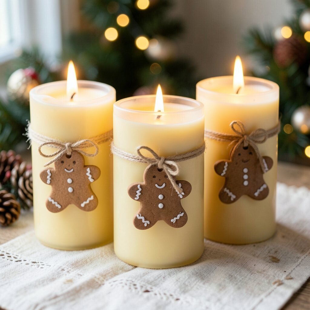 Gingerbread tags add a sweet and playful touch to beeswax candles. The warm brown paper and cookie-shaped design make the candles feel like part of a holiday kitchen scene.