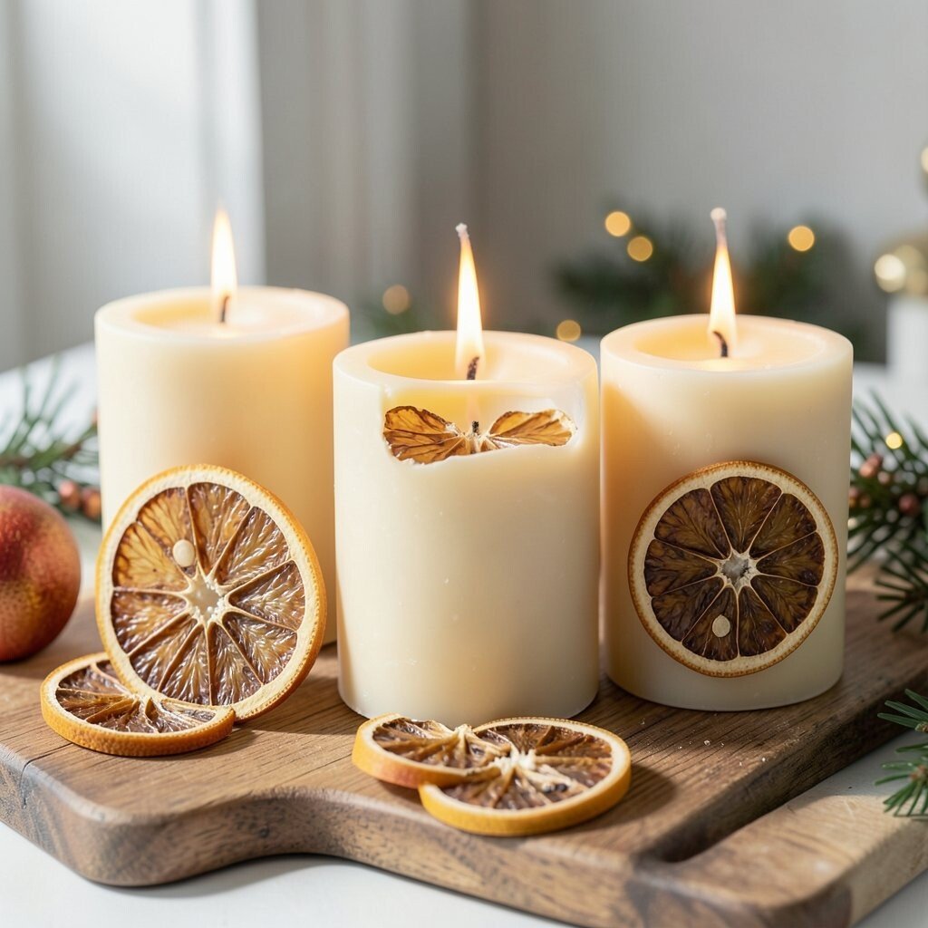Dried citrus adds a bright, cheerful look to beeswax candles. The orange and lemon slices bring a sunny color that feels fresh against the warm wax.