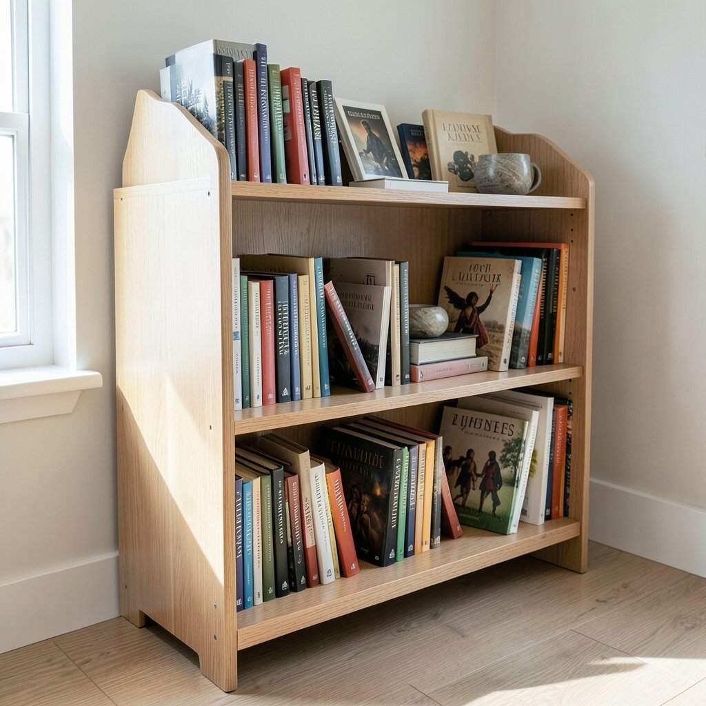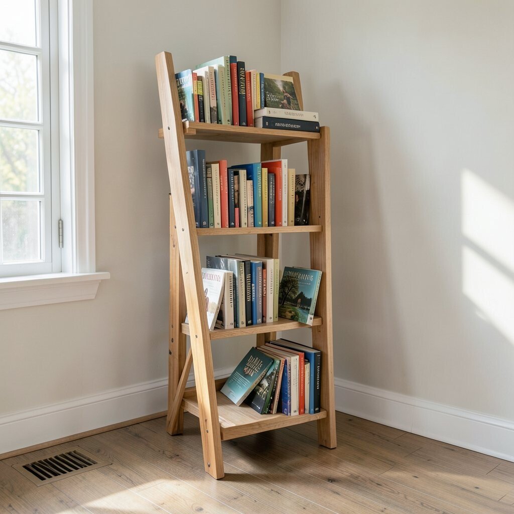 This design saves space and displays books beautifully. Personalize it with paint or stain. Costs vary, but it’s often cheaper than store-bought options.