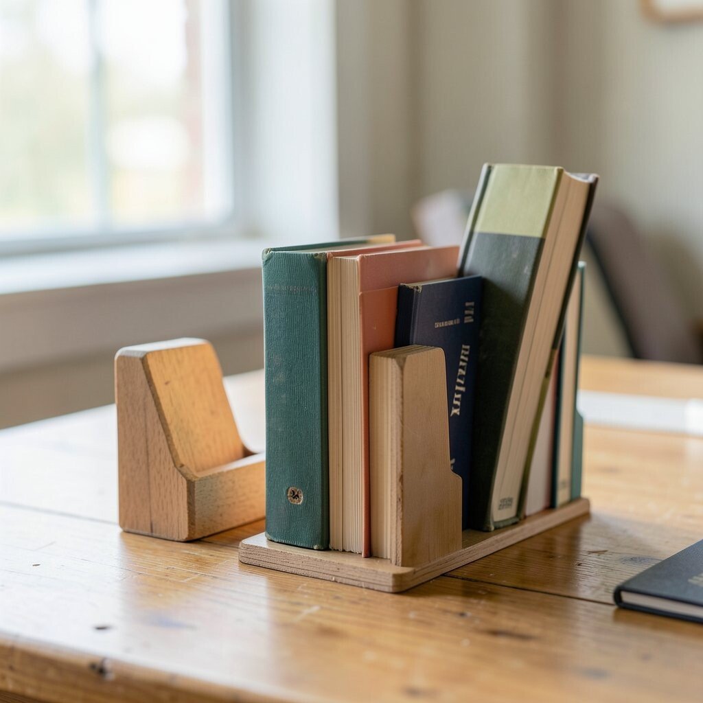 Create unique bookends with concrete, wood, or even old toys. Mold or paint them to suit your style. They keep your books organized and add character to your shelf.