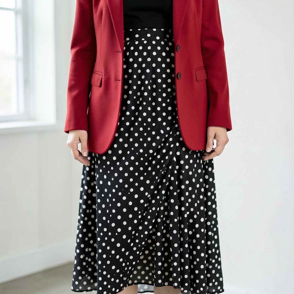 Combine classic and bold with a polka dot draped skirt and a vibrant red blazer. This pairing is perfect for making a strong yet playful impression.