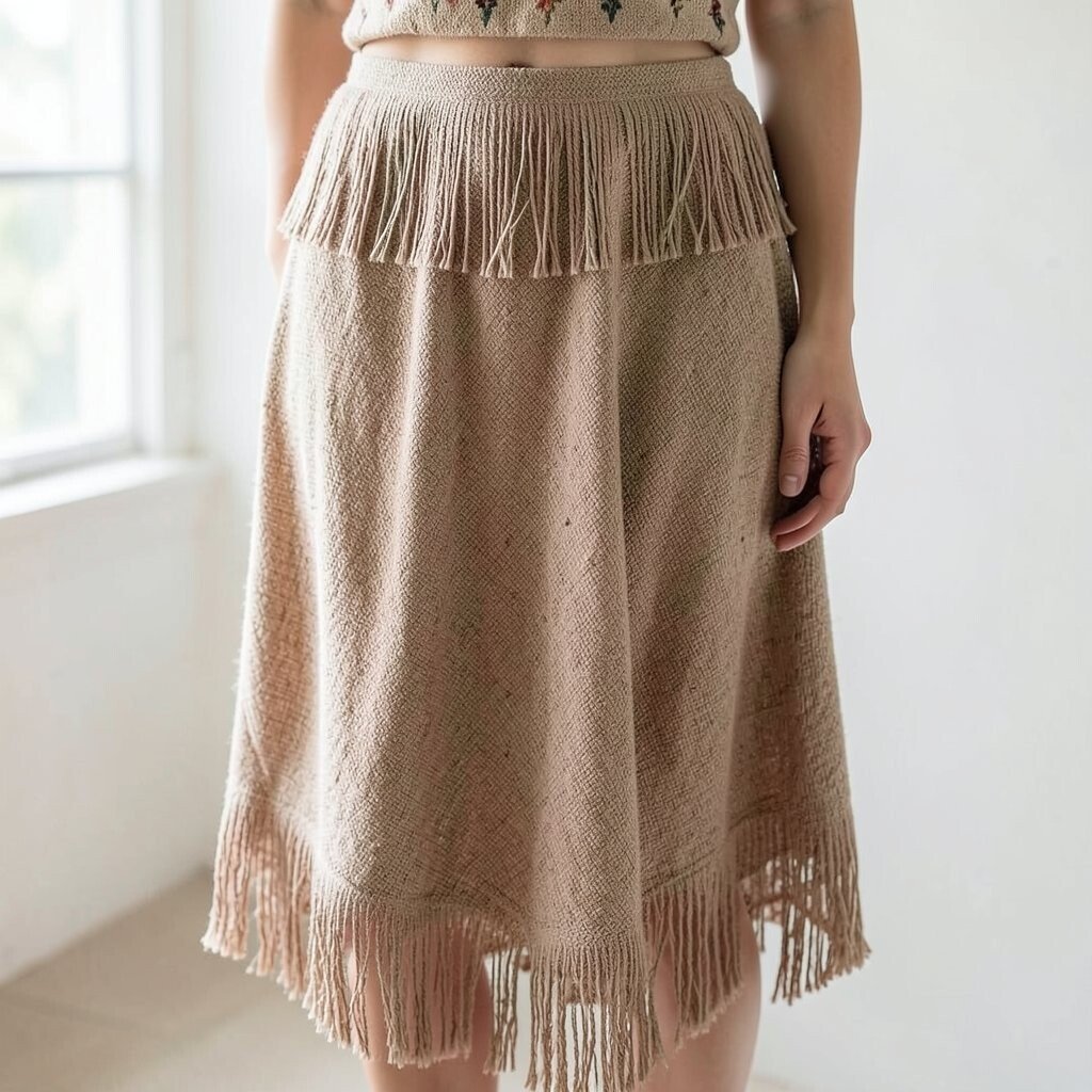 Fringe tops add movement and fun to your outfit. A draped skirt in earthy tones completes the boho look.