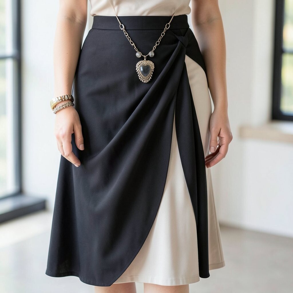 Monochrome outfits are timeless, and a draped skirt in a single color can be incredibly chic. A statement necklace adds a focal point.