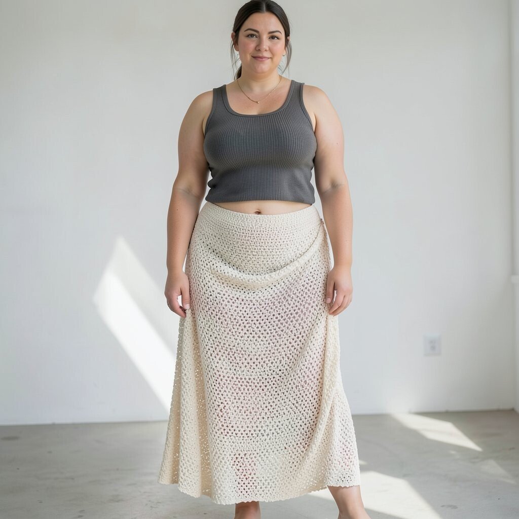 Embrace a bohemian vibe with a crochet draped skirt and a simple tank top. This outfit is perfect for sunny days.