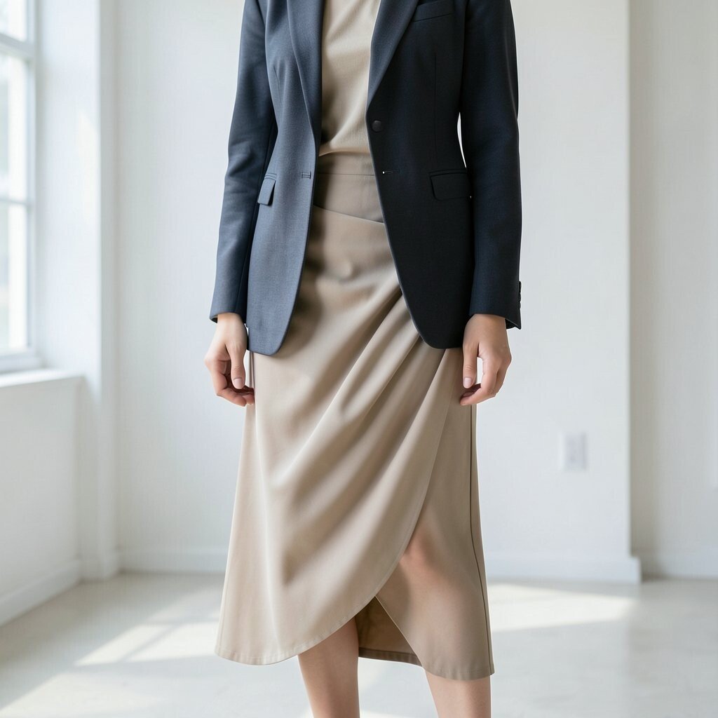 Step into the future with an asymmetrical draped skirt and a tailored blazer. This look is avant-garde and polished.