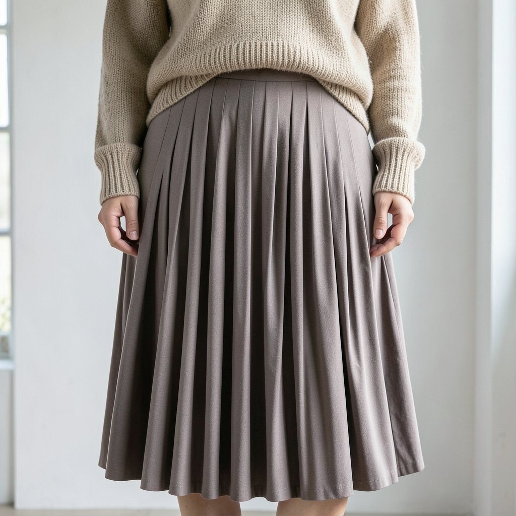 The pleats create a flattering silhouette while adding texture. A sweater adds warmth and comfort.
