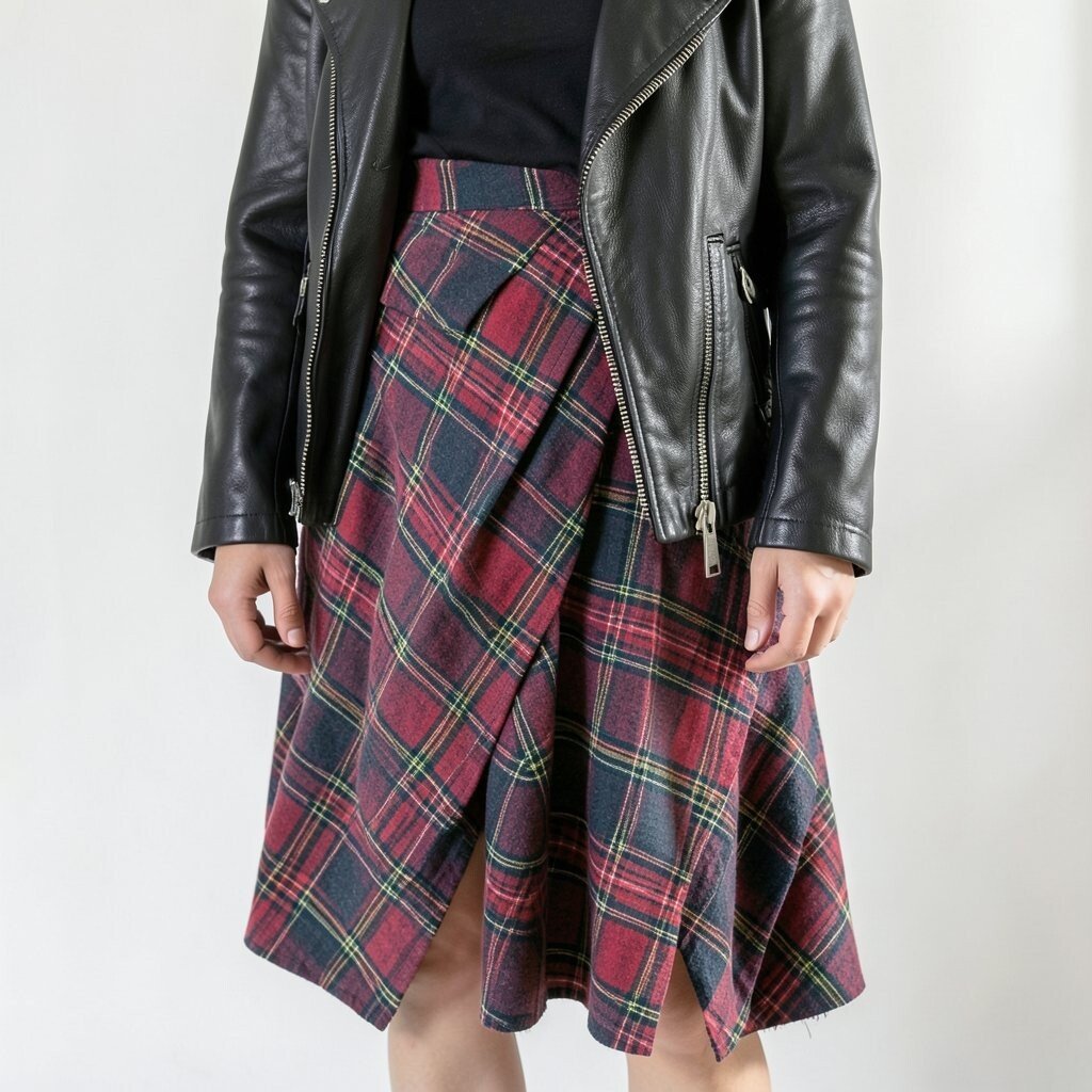 The plaid pattern adds a touch of tradition, while the leather jacket brings a modern twist. Wear with combat boots for an all-out edgy look.