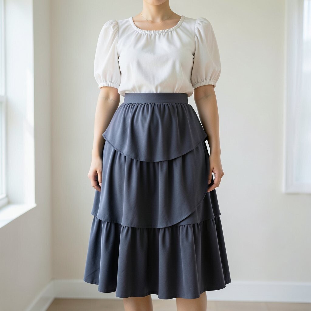 The layers of a tiered skirt create movement and interest. Puff sleeves add a playful element to the ensemble.