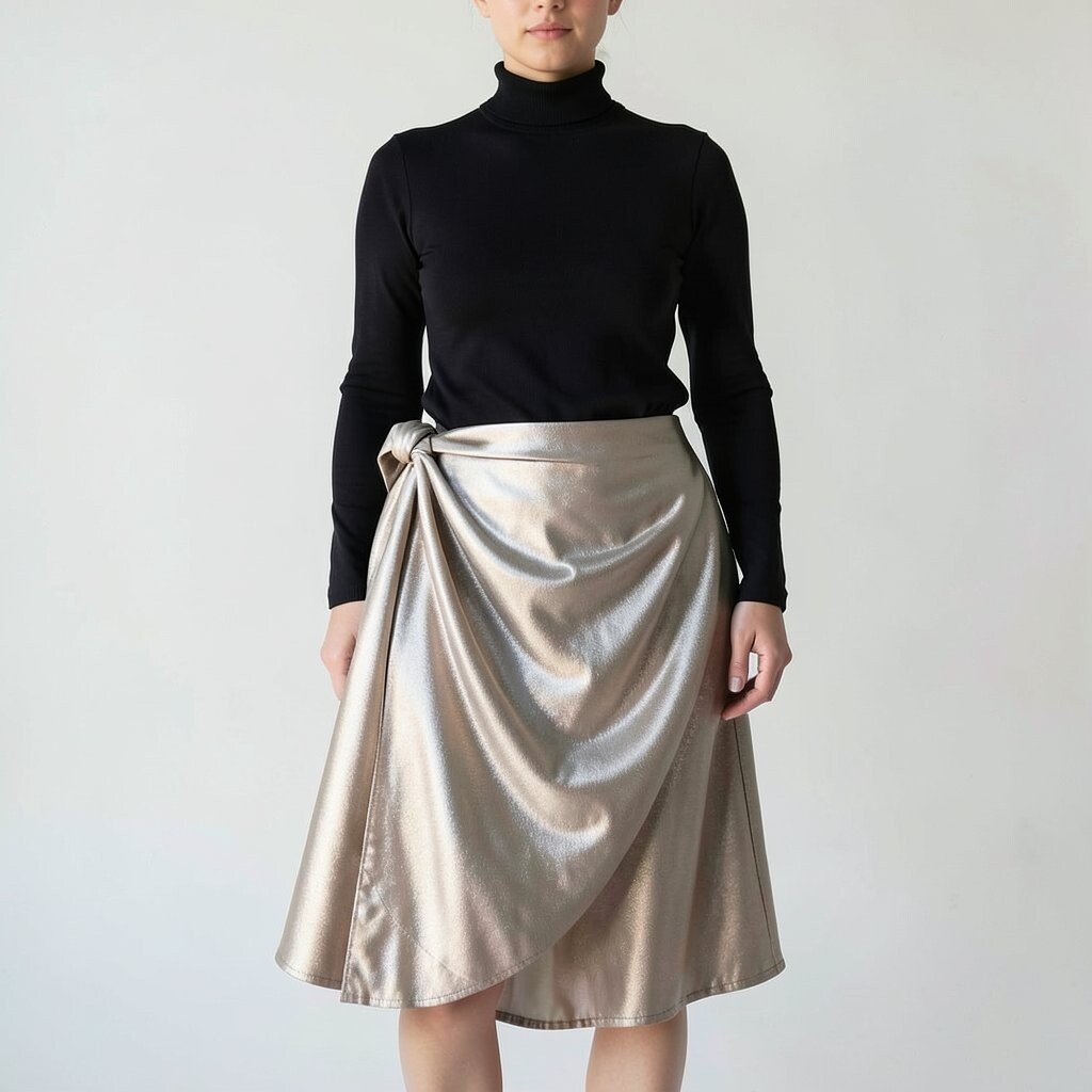 Shine bright with a metallic draped skirt combined with a black turtleneck. This look screams sophistication and modernity.