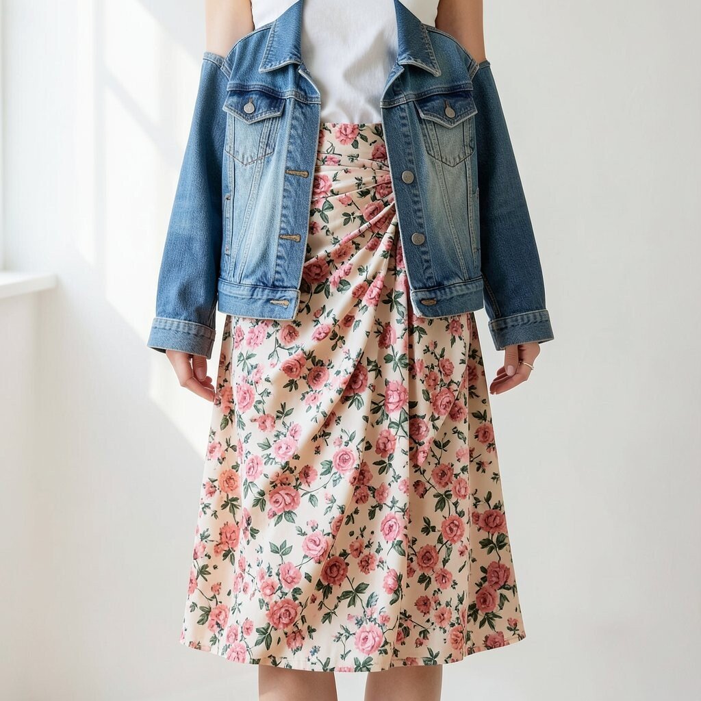 2. Floral Draped Skirt with Denim Jacket