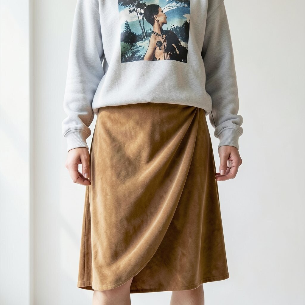 Suede offers a rich texture that pairs wonderfully with a graphic sweatshirt. This look is a blend of comfort and style.