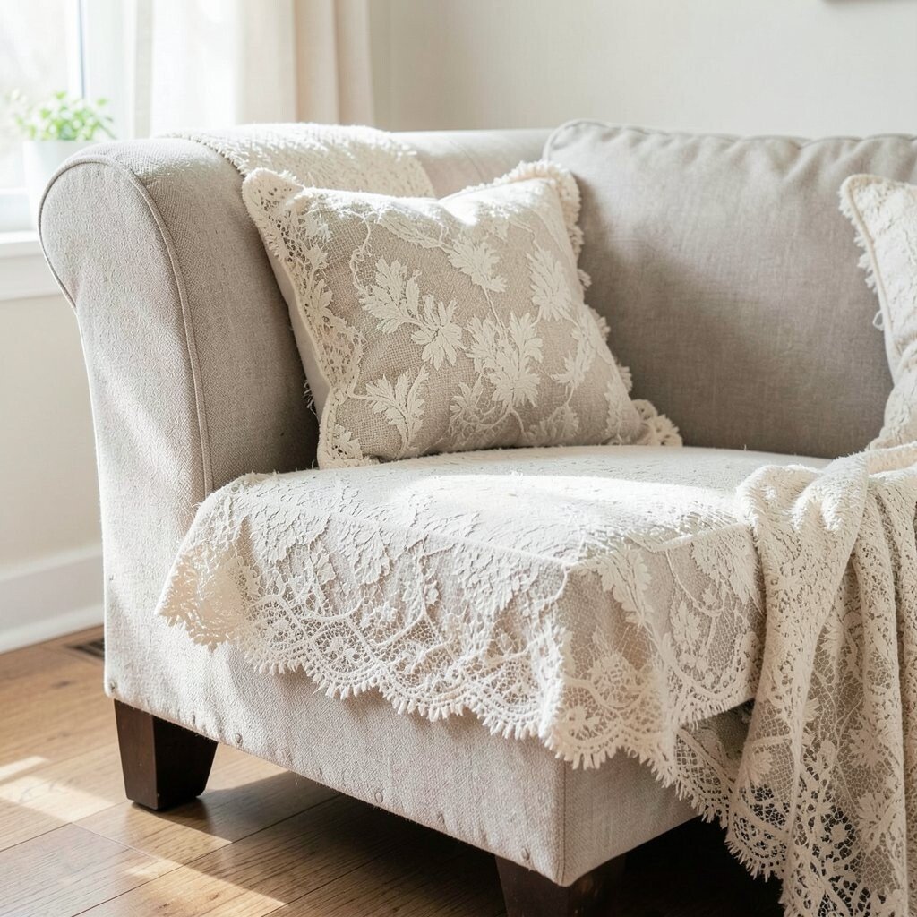 Lace can soften the hard lines of your couch. It’s a vintage trend making a comeback. Your living room will look like a page from a fairy tale!