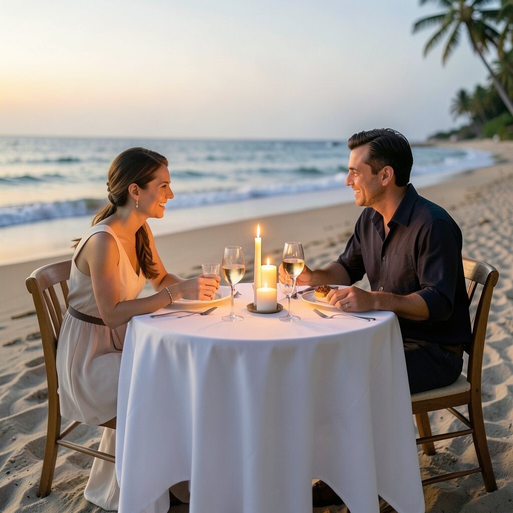 Enjoy a candlelit dinner with the sound of waves and the scent of the ocean. The beach setting provides a naturally beautiful backdrop for an intimate and romantic evening.