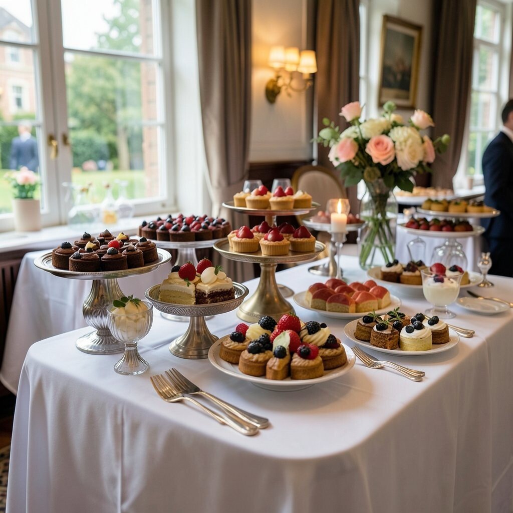 Decorate with flowers and elegant serving dishes. This idea is versatile and can be adapted to any theme. It’s perfect for those who love desserts and enjoy a touch of elegance.