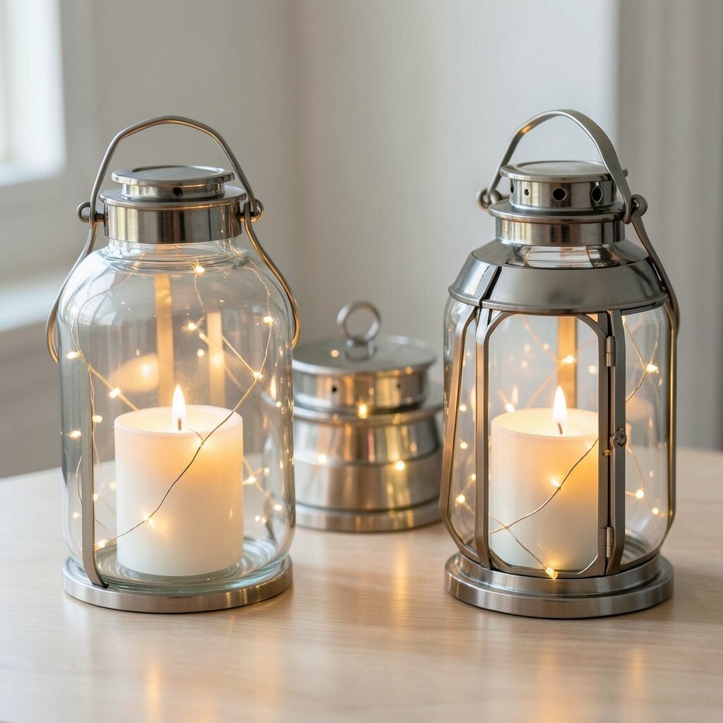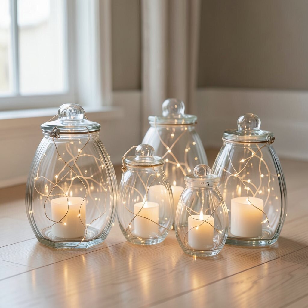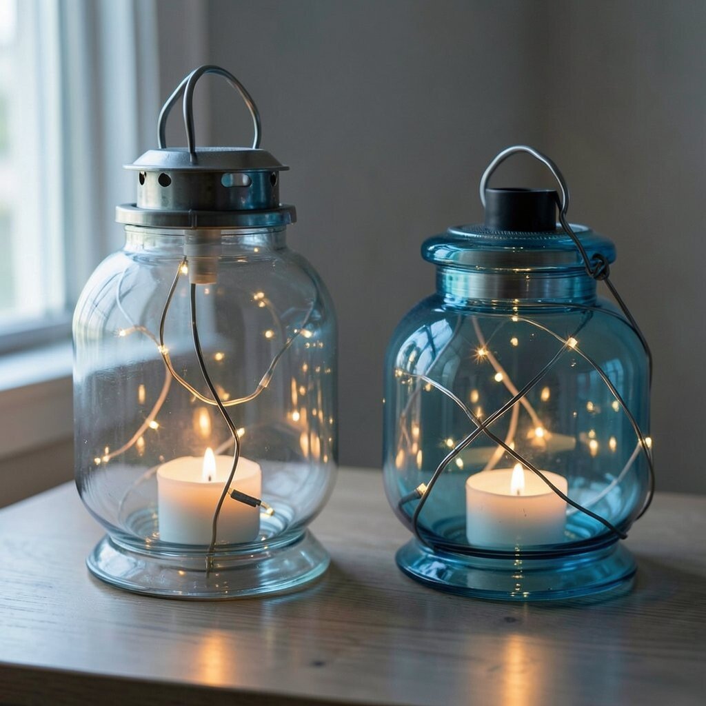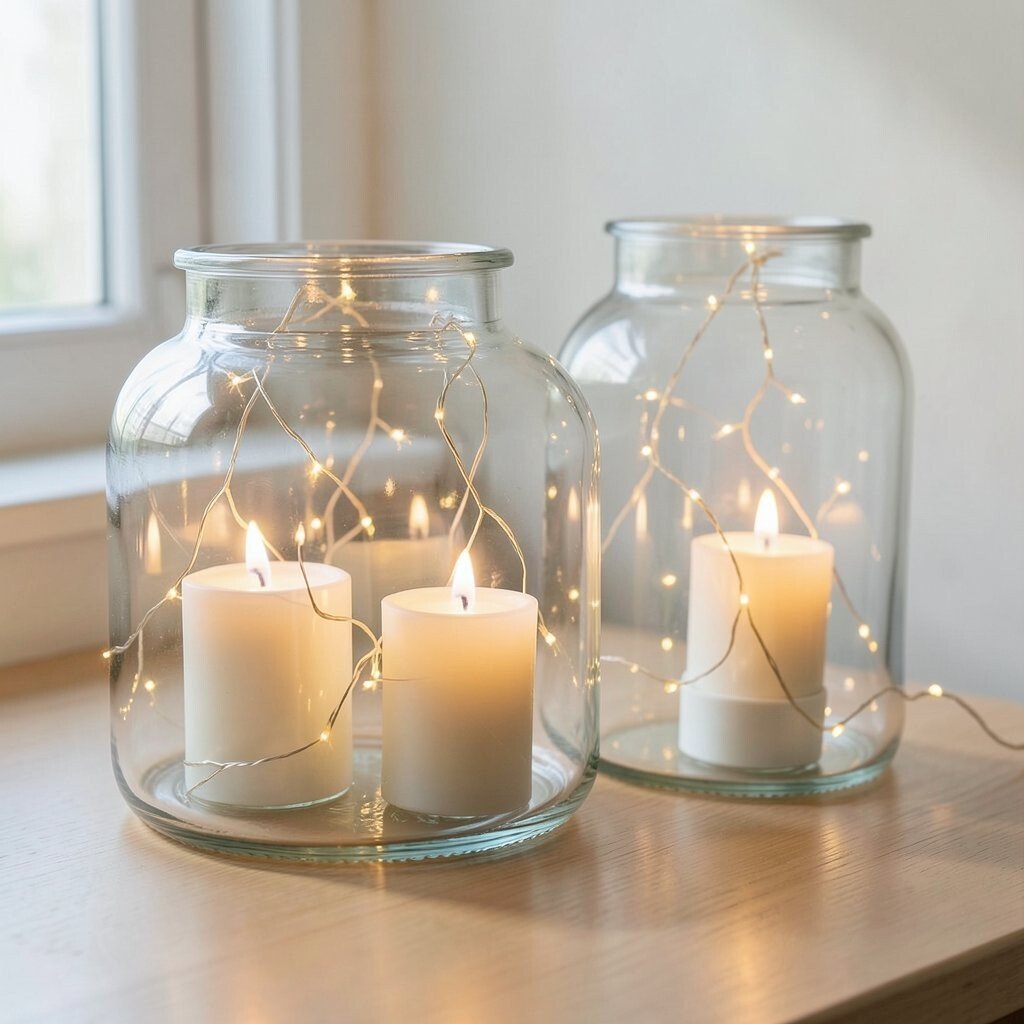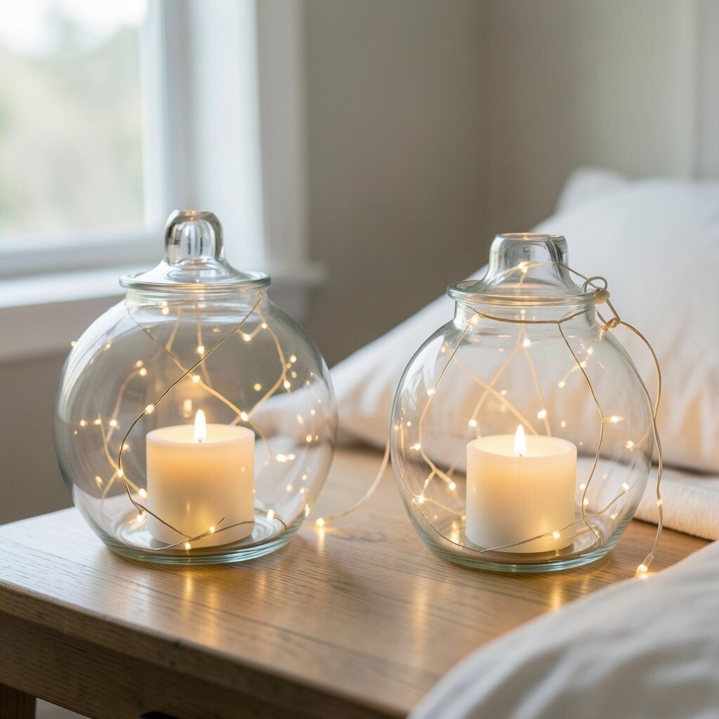 Soft light can make any space feel calm and special. Glass lanterns with fairy lights bring that glow with style.